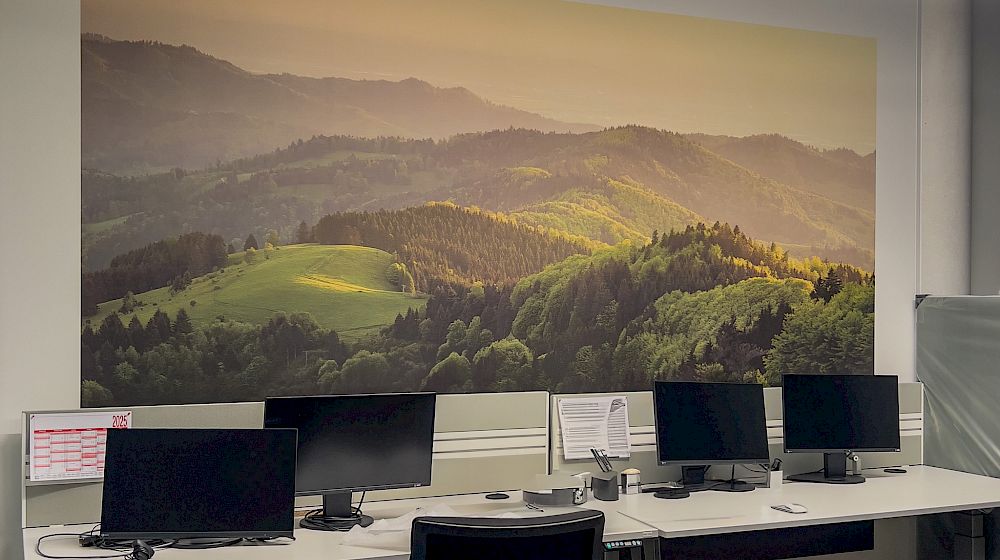 Manchmal braucht es nicht viele Worte — manchmal braucht es einfach nur Ruhe. Genau darum ging es bei unserem jüngsten Projekt im Rathaus Stühlinger in Freiburg. Das neue Bürokonzept dort setzt auf flexible Arbeitsbereiche, und zwei Räume wurden bewusst als stille Zonen gestaltet. Kein Telefon, kein Flüstern, kein Smalltalk — nur konzentriertes Arbeiten. Um diese Atmosphäre auch visuell zu unterstreichen, kam ein ganz besonderes Motiv an die Wand: der Schwarzwald, groß, tief und beruhigend.
