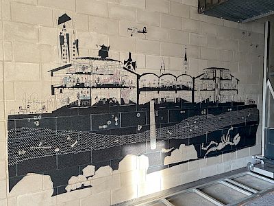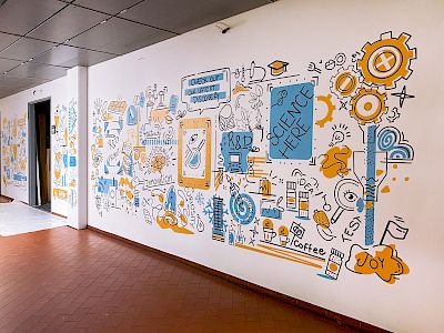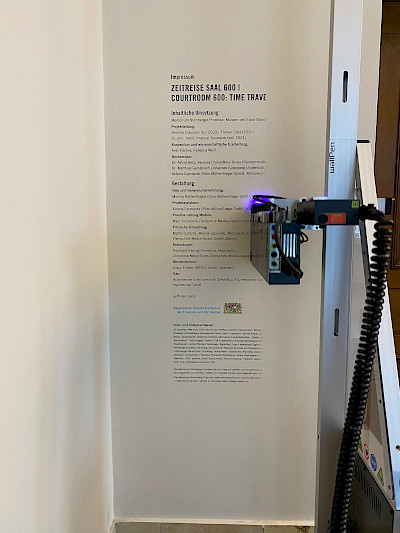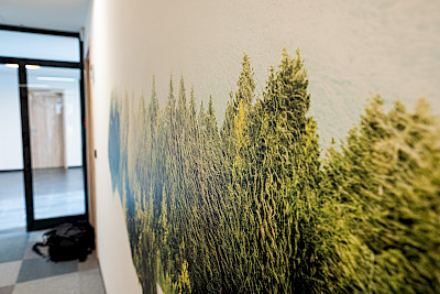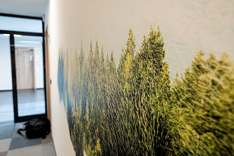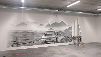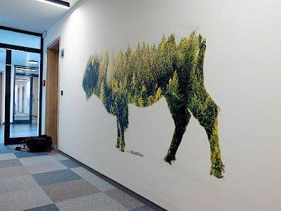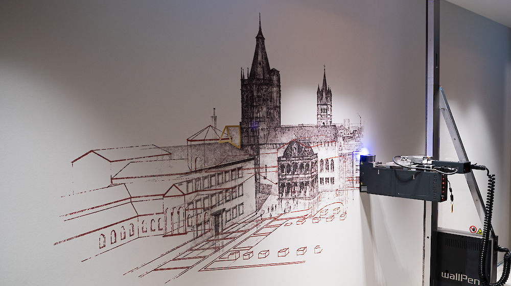 Aufgrund der Einschränkungen der Tintenstrahl-Technologie gibt es in Ecken Ränder zu den benachbarten Wänden, zum Boden und zur Decke. Diese betragen links 6 cm, rechts 10 cm, oben 40 cm und unten 25 cm.