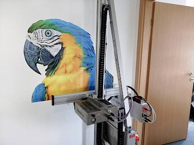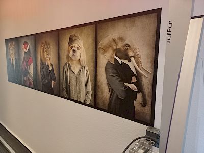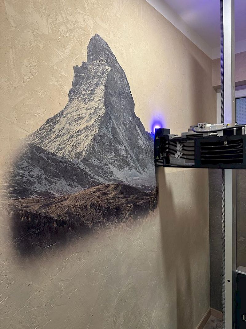 Wir verwenden eine sehr widerstandsfähige, kunststoffähnliche UV-Tinte, die unter den integrierten UV-Härtungslampen sofort aushärtet und auf fast allen Untergründen verwendet werden kann. So sind Putz, Tapeten, Holz, Ziegel, Latexfarben, Stein, Klinker, Kunststoff, Metall, Glas, die meisten Fliesen und viele andere Materialien ohne Probleme bedruckbar.